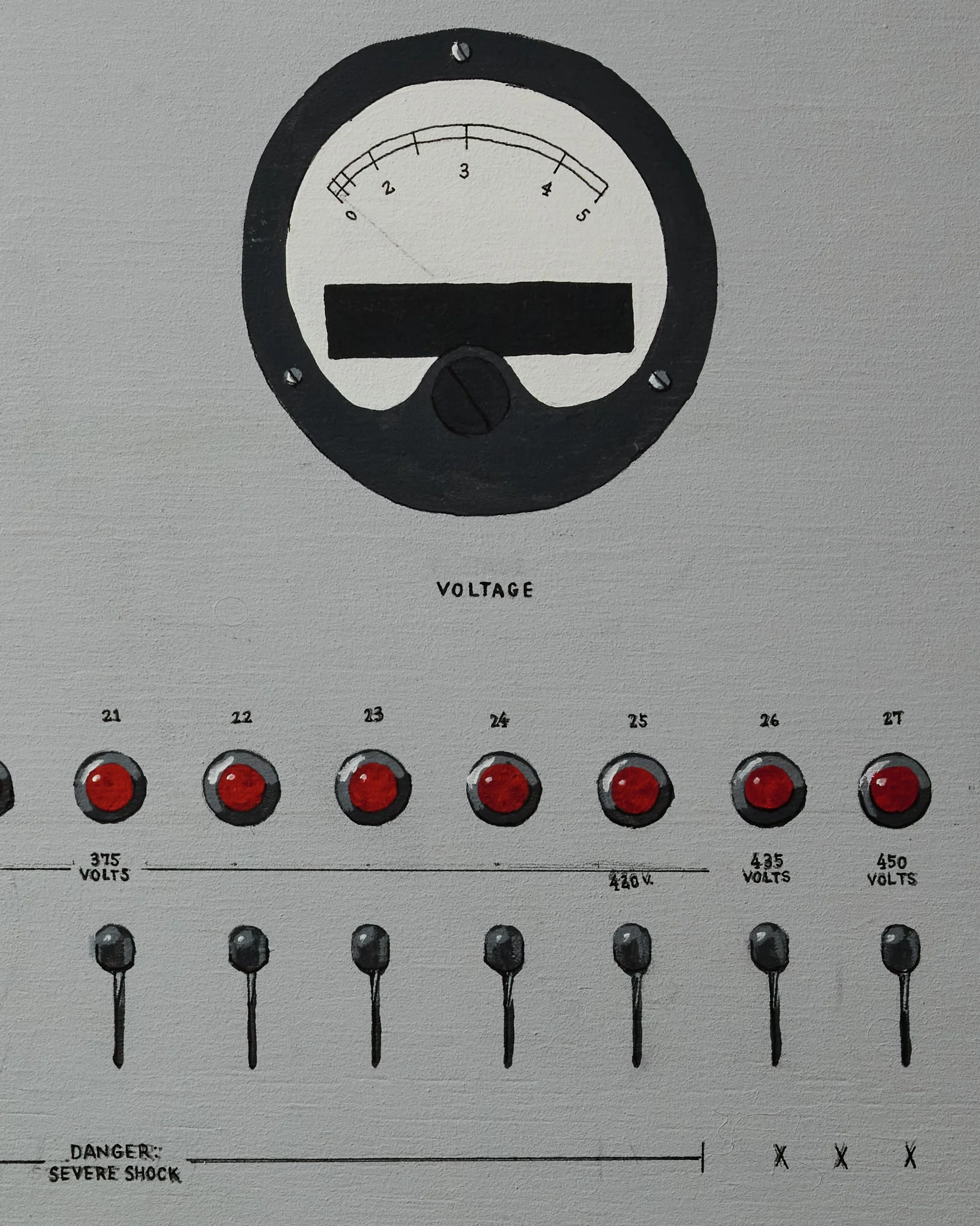 I don’t know really what control panels do, but I love what they look like. So I’ve painted a few. This one’s from the Milgram experiment. I plan to electrocute it one day.