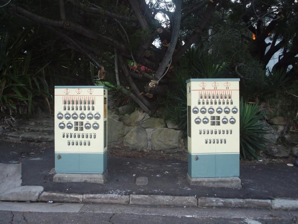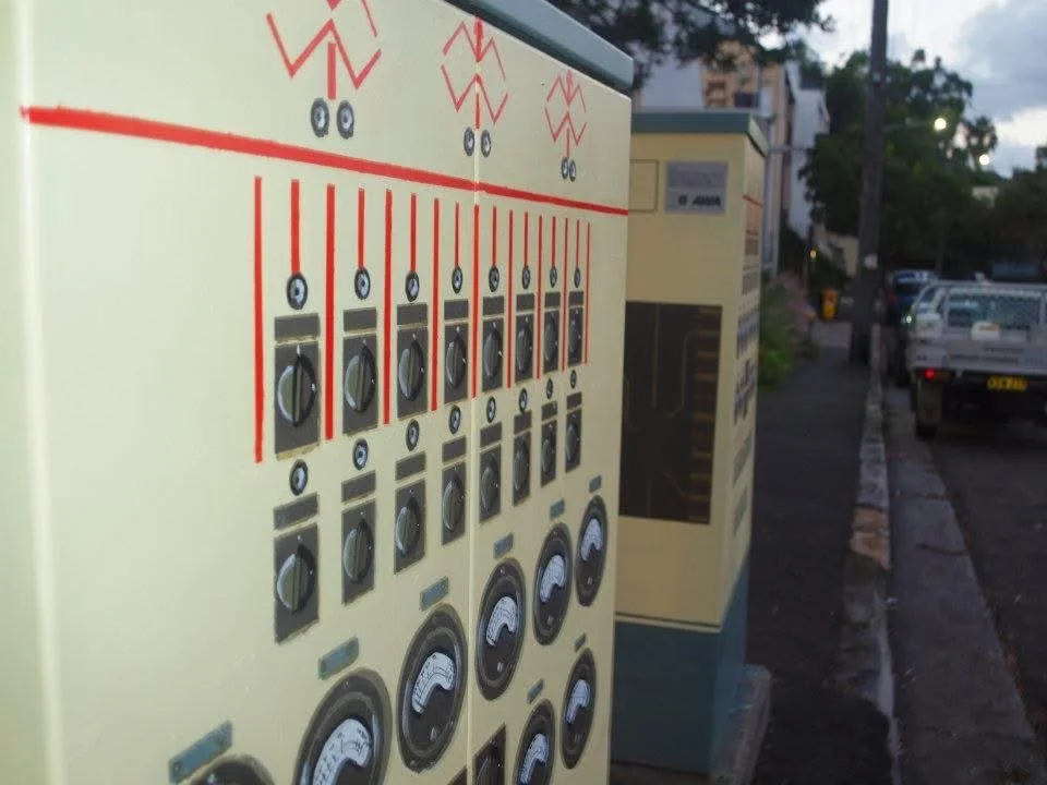 I won a competition in Sydney to paint the electrical boxes directly opposite the iconic old power station. The idea stemmed from finding old pictures of control panel boxes from when it was a working factory. I wanted to bring them out onto the street, almost as if you could still control the building using them.